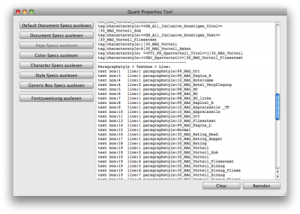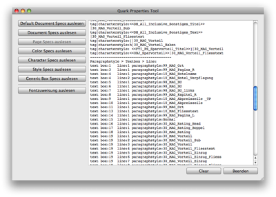 Dieses kleine Tool ist mir sehr hilfreich bei meinem Database Publishing Projekt. Mit diesem kann ich meine ersten Test ausführen. Dieses ist aber noch nicht komplett fertig. Es fehlen noch die Orthogonalen Linien. Dann kann ich an den Feinschliff gehen wie ich die gesammelten Daten am besten in die Datenbank bekomme ? und natürlich auch wieder zurück ins Quark Dokument. Ab Quark 7 soll mein DBPS funktionieren. Quark 8 ist schon im Anmarsch. Ich hoffe es wurde nicht zu viel an Applescript rumgeschraubt bzw. gönzlich entfernt.