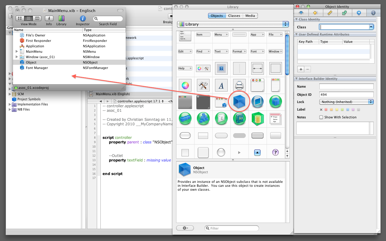 Ist der IB gestartet zieht man aus der Library ein NSObject in das MainMenu.xib Fenster.