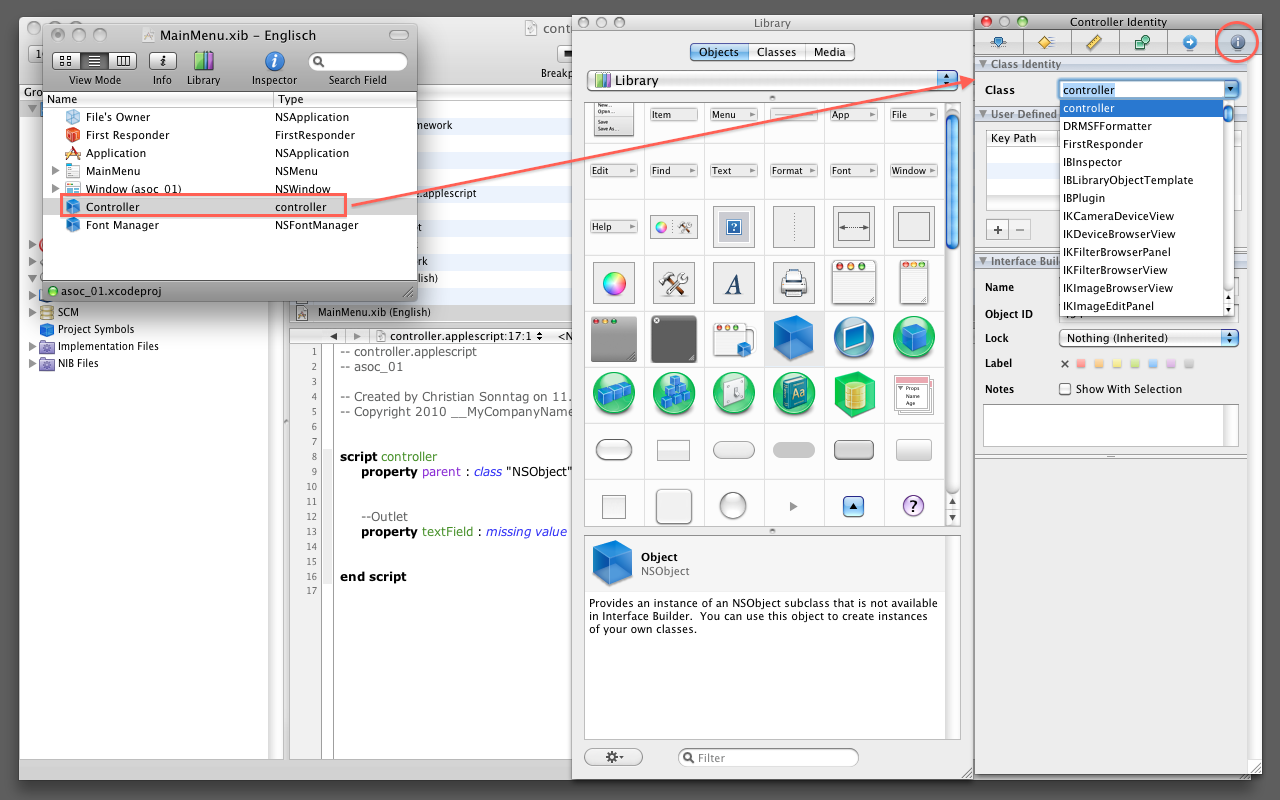 Das NSObject ist nun mit der controller.applescript Klasse verknüpft und kann dessen Outlets verwenden.