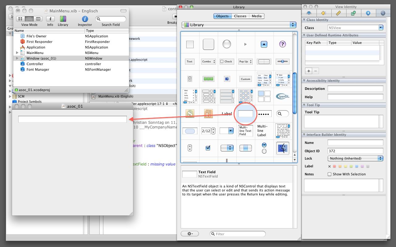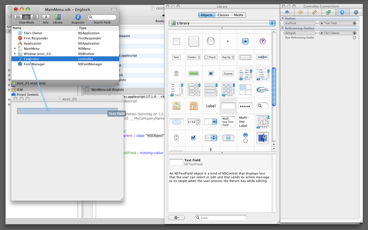 Als nächstes ziehen wir ein NSTextField in das Projektfenster. Nun haben wir ein Interfaceobjekt das mit dem Outlet aus der ASOC Klasse verbunden werden kann.