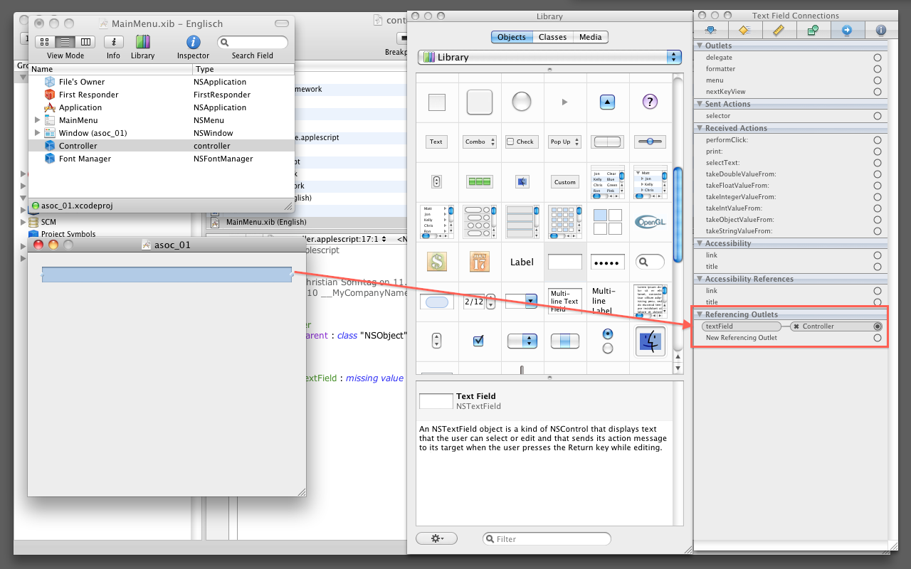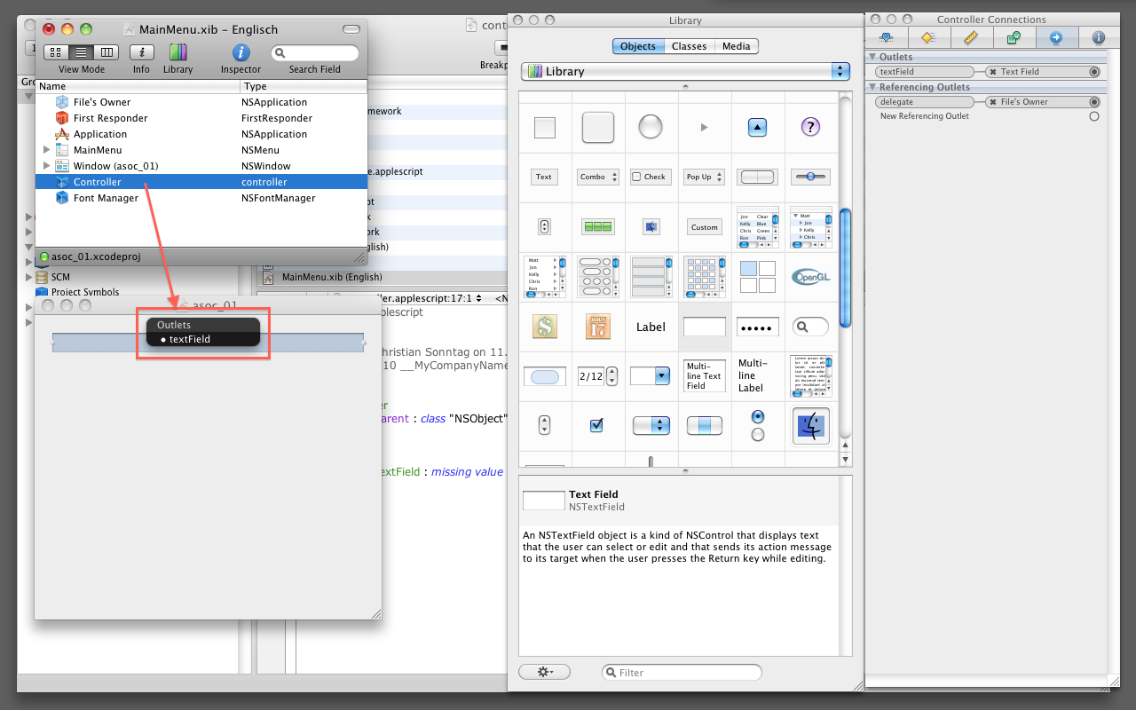 Über dem NSTextField die Maustaste wieder loslassen. Interface Builder sind alle Outlets der verknüpften Klasse bekannt und zeigt diese in einem kleinen grauen Fenster an. Das gewünschte Outlet kann nun ausgewählt werden. Im Beispiel ist es das Outlet "textField".