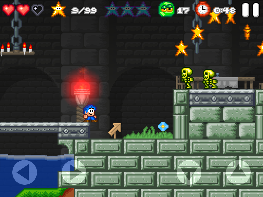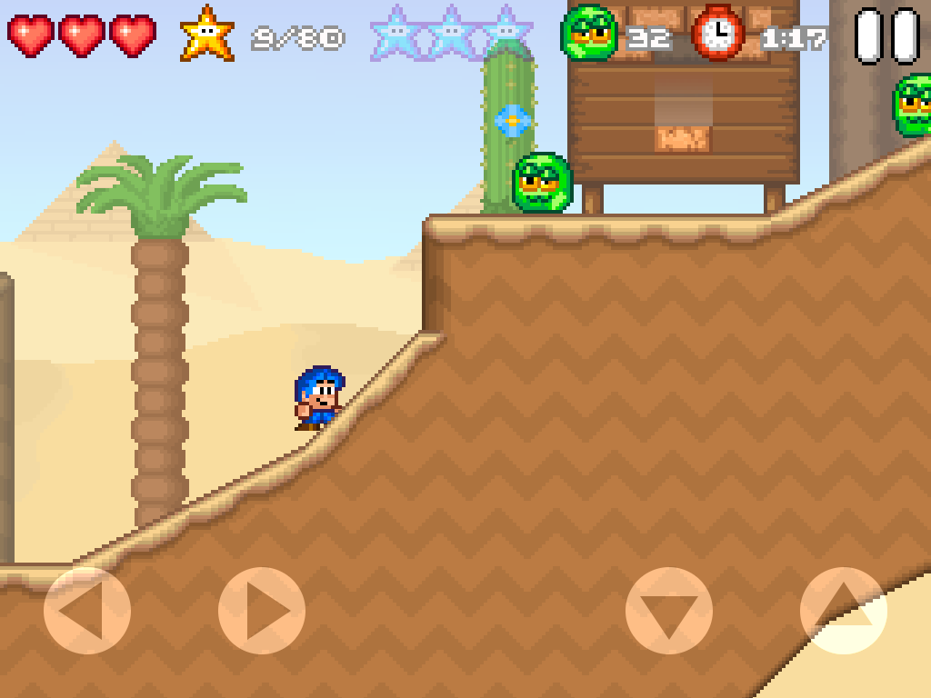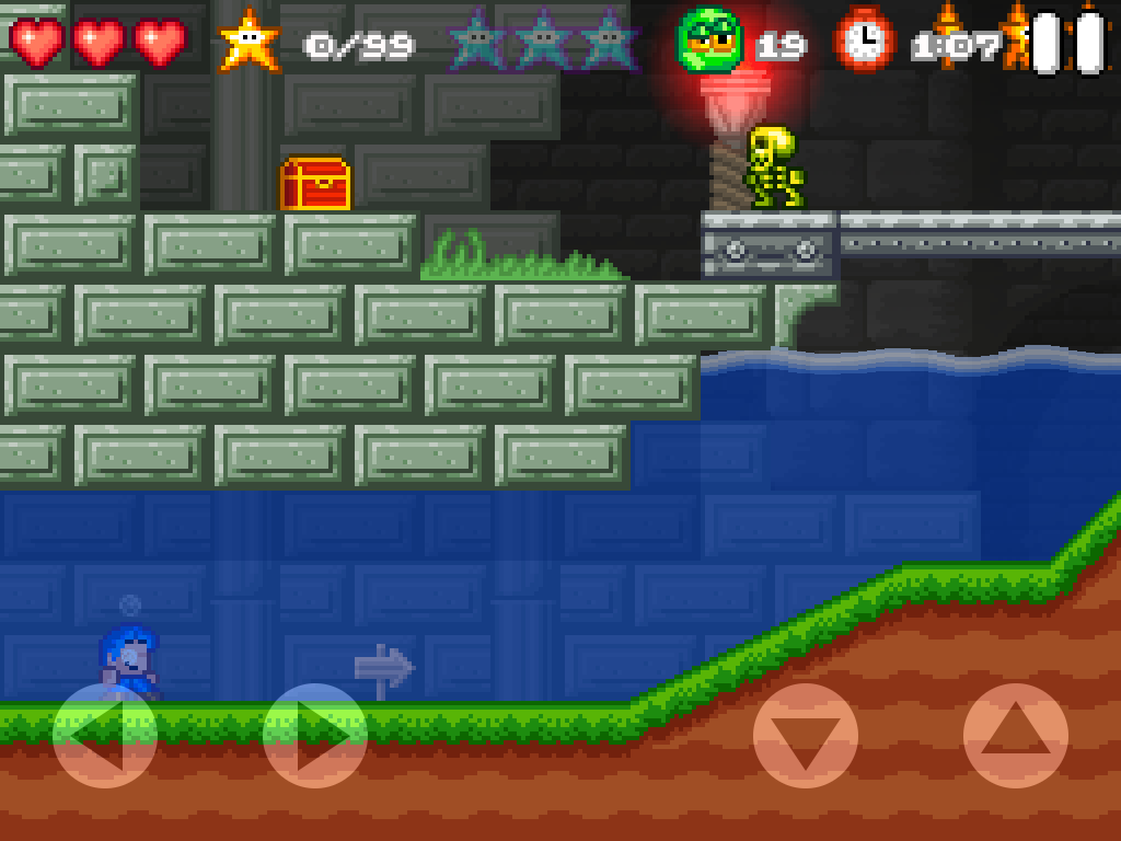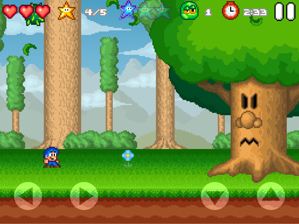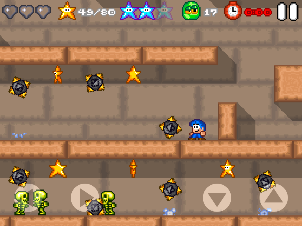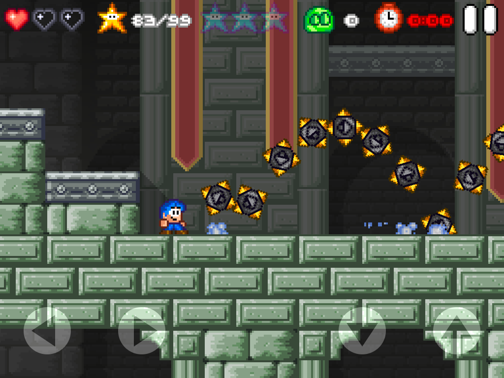 Alles ist im feinsten Retrostyle liebevoll gezeichnet und auch dem Sound merkt man diesen an. Das Gameplay ist ein klassischer Platformer. Die Touch-Steuerung ist sehr präzise und lässt keine realen Knöpfe vermissen. In allen Levels gibts es mehrere Ziele die es zu erreichen gilt. Zeitlimit, alle Sterne, alle blauen Sterne, usw. für Spielspaß ist also gesorgt. 100% Gamer werden hier Ihre wahre Freude haben. Der Schwierigkeitsgrad steigt nach dem ersten Endgegner deutlich an.