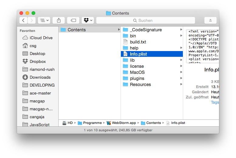 Erster kleiner Schreck nach dem Update auf OS X Yosemite. Meine geliebte WebStorm IDE startet nicht mehr. Doch es war schnell eine Lösung dazu zu finden. Der einfachste fix ist sich mit einem Rechtsklick auf das WebStorm App Icon den Paketinhalt zeigen zu lassen.